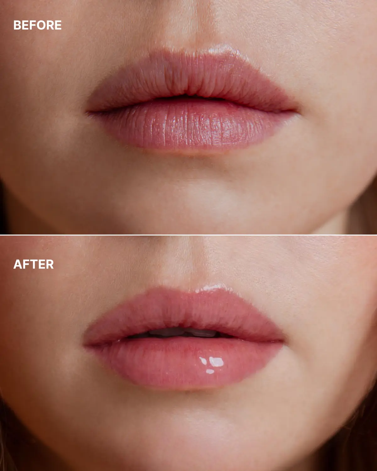 - Видимий глянцевий блиск на губах