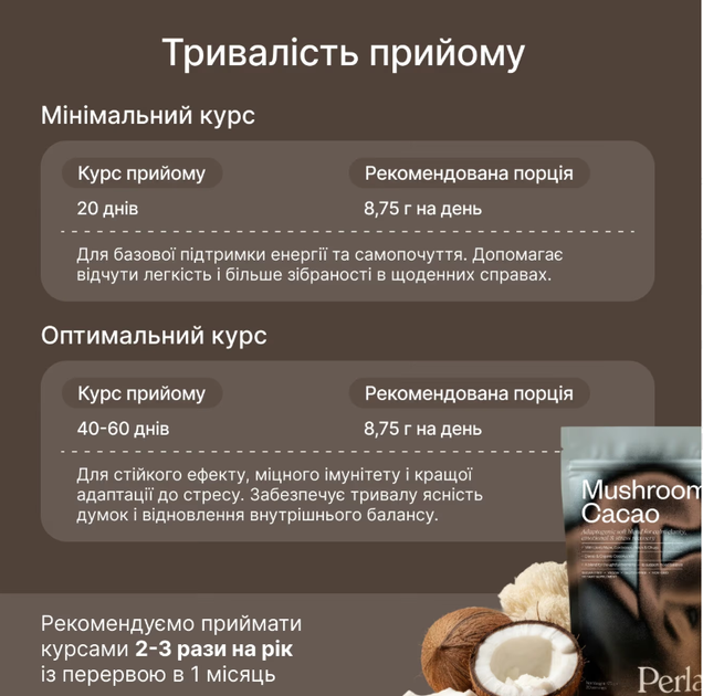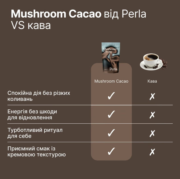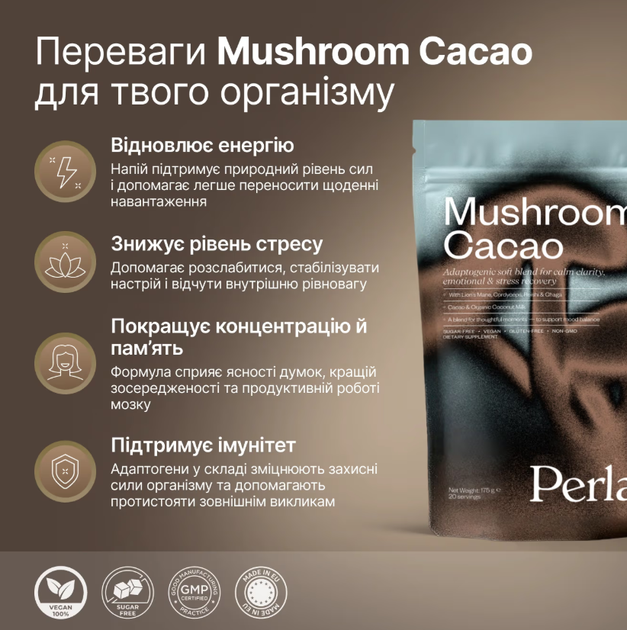 Функціональний напій із какао та грибами-адаптогенами PerlaHelsa Mushroom Cacao, 175 г