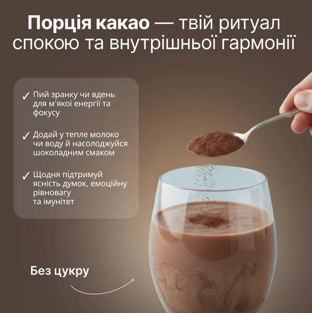- Какао-порошок — надає смак, забезпечує антиоксидантну підтримку та м’яку стимуляцію.