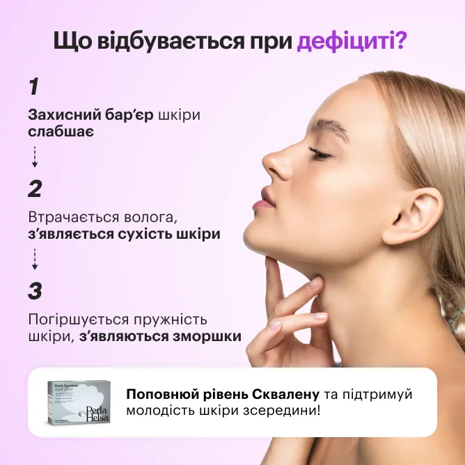 Сквален у капсулах — натуральний компонент, що природно присутній у структурі шкіри. Продукт призначений для щоденного прийому з метою підтримки еластичності та зволоженості шкіри, а також загального тонусу організму.